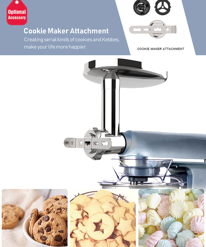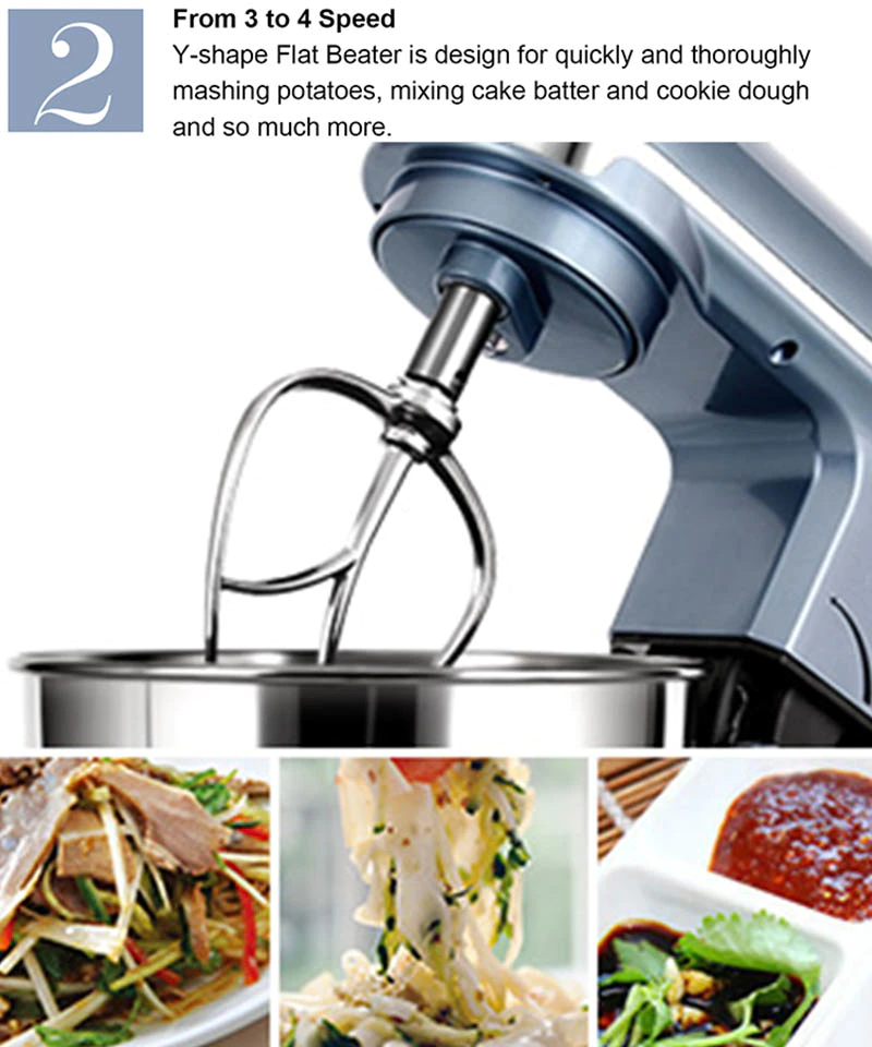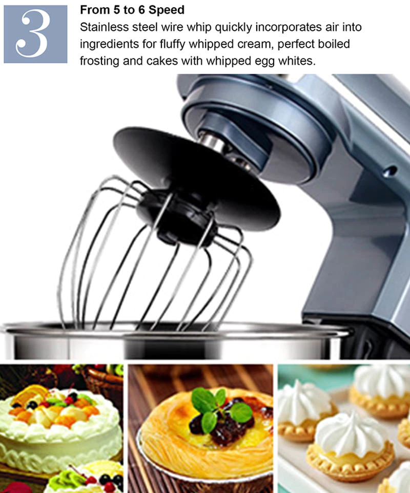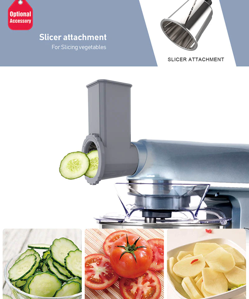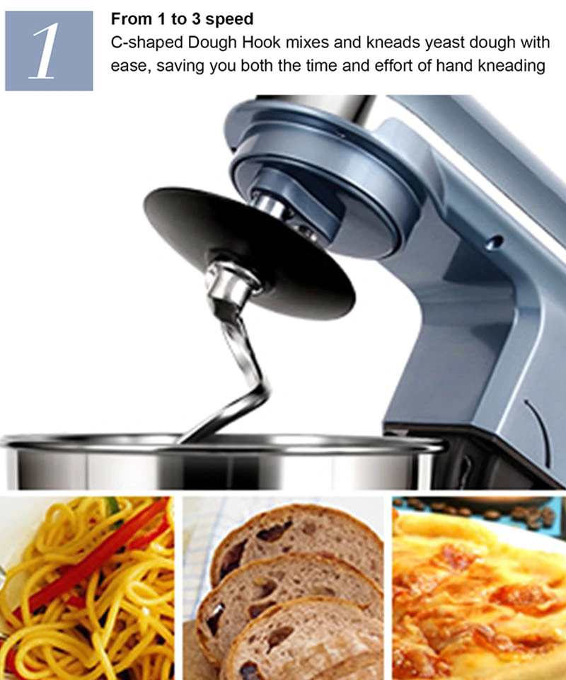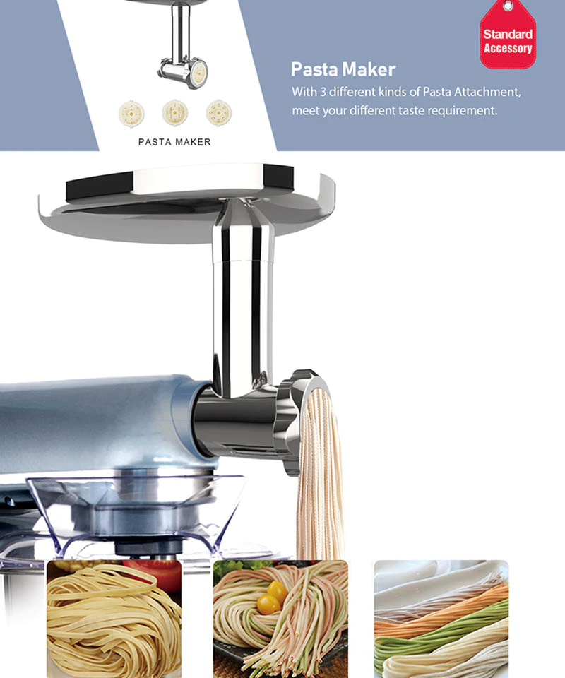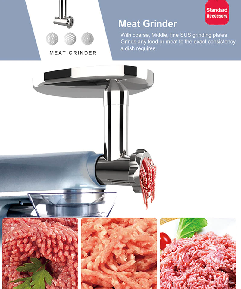 | Standard Accessories | Dough hook, Mixing Beater, Egg Whisk, Blender, Meat grinder | Place of Origin | Dongguan, China |