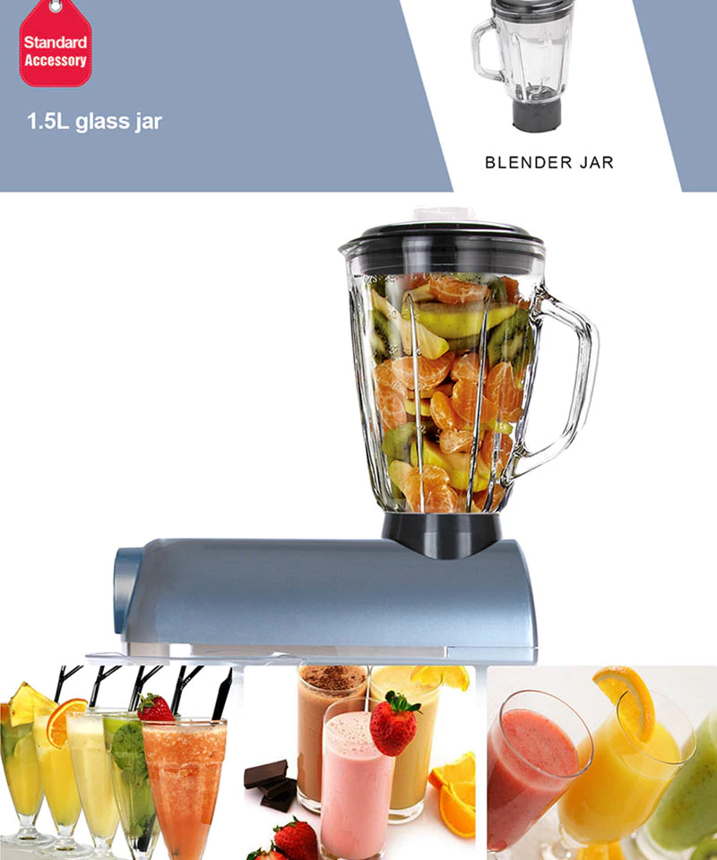 * Equipped with five accessories including wire whip, C-shape dough hook, Y-shape flat beater, 1.5L glass jar, meat grinder and pouring shield offering mixing versatility to blend, beat, whip,knead, mix eggs or cream.